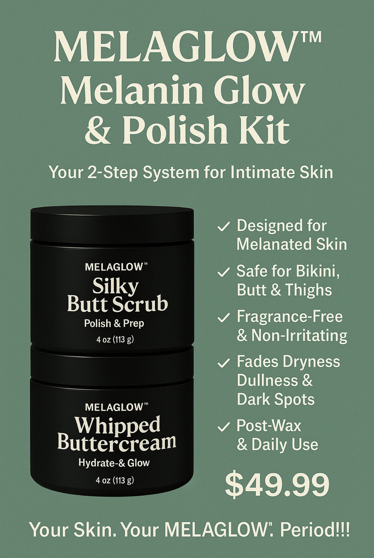 The MELAGLOW™ Melanin Glow & Polish Kit is your 2-step, fragrance-free system for smooth, radiant skin where it matters most — thighs, butt, and bikini. Made for melanated skin. The glow-up combo you didn’t know you needed: